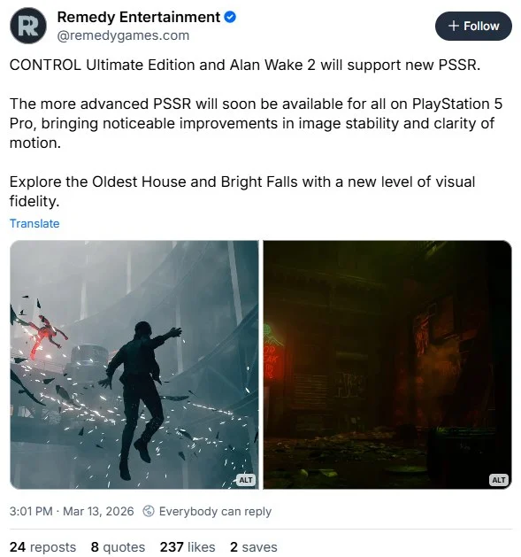 „Jakmile bude nové PSSR k dispozici, automaticky hry vylepší. V Alan Wake 2 dojde ke zlepšení v několika problémových oblastí, jako jsou například blikající ploty, elektrické vedení a podobně. Neměl jsem moc času to sledovat, protože nás zaměstnává CONTROL Resonant,“ dodal na sociální síti X Thomas Puha z Remedy.