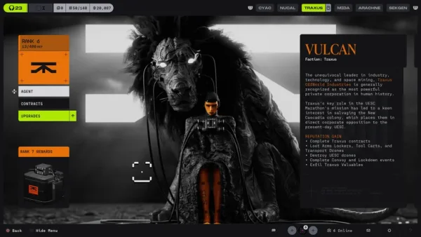 V Marathonu hrají velmi důležitou roli frakce. Těch je šest a nejenže posouvají příběh kupředu, ale zároveň pro ně můžete plnit úkoly a tím je levelovat. Za splněné úkoly/smlouvy získáváte odměny v podobě vybavení, ale zároveň se vám odemyká možnost kupovat stálé upgrady. Díky nim si můžete zlepšit pasivní statistiky u Runnerů, aby se třeba při běhu tak rychle nepřehřáli, případně rozšiřovat vault nebo si odemykat v obchodě různé vybavení, které je možné kupovat za herní měnu. Systém upgradů frakcí je vymyšlen velmi dobře, stejně tak systém smluv se mi líbí, ale co je už horší, je samotná jejich kvalita. Smlouvy nejsou moc nápadité a většinou jen vyžadují, abyste něco na mapách našli a extrahovali, případně zabili určitý počet nepřátel či hacknuli počítač. Jsem toho názoru, že tyto úkoly mohly být kreativnější a zábavnější, stejně tak se mi nelíbí, že je možné plnit pouze jednu smlouvu najednou. To jen zbytečně brzdí postup. Zvláště ve chvíli, když musíte splnit více částí úkolu najednou v jedné hře, což je kolikrát neskutečně obtížné, ať už kvůli přítomnosti klasických nepřátel tak ostatních hráčů. Několikrát se mi proto stalo, že jsem se na jednom úkolu zasekl na dlouhé hodiny.